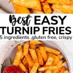 Learn how to make turnip fries in the oven with just 5 ingredients and 5 minutes of prep. These baked turnip fries are a perfect side dish for all French fries lovers but without the carbs and calories.