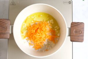 Add oil to a nonstick pan over medium-high heat. Cook the onion, garlic, and shredded carrots for about 5 minutes or until tender.