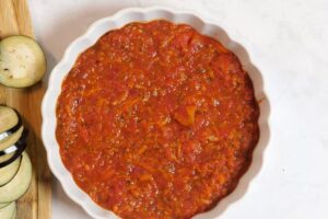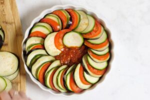 Arrange the sliced eggplant, zucchini, and tomatoes in a circular pattern.
