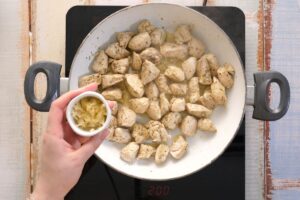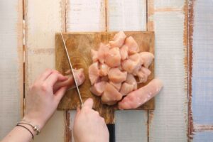 Begin by cutting the chicken breast into bite-sized pieces of approximately equal size