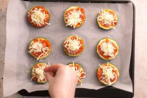Bake the zucchini pizza bites for 5 minutes in the preheated oven, then broil for another 5 minutes until the cheese is golden brown and melted.
