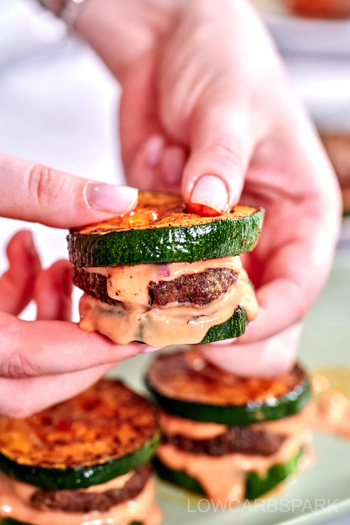 Low-carb zucchini slider layered with juicy beef and creamy sauce.